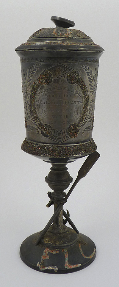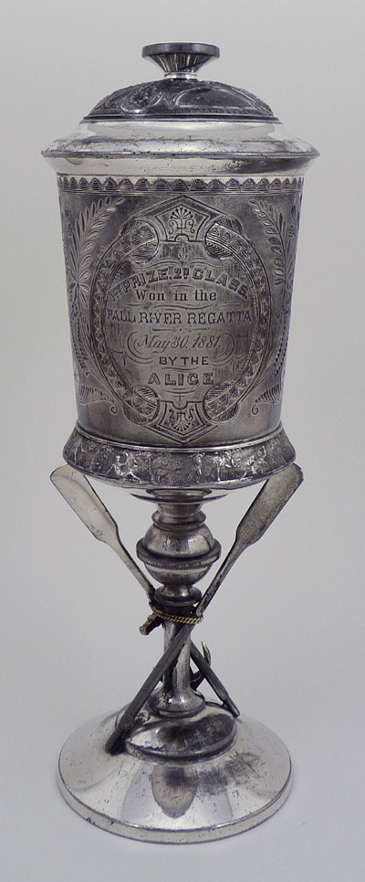 All that glitters? Well, someone got ahold of this Rogers 1881 plated regatta trophy and decided it would look infinitely better with glued 3-dimensional sparkles. When I received it I was horrified, then amused. The customer wanted to donate it to the Fall River (Massachusetts) Historical Society, and requested it be put back to the condition it was in prior to its defacing. I removed the glue and sparkles, reattached the oar section, straighten the cup, removed dents, corrected the body and cover rims, and gave it some major cleaning. It's now ready to be seen by the public with just enough silver remaining to make it presentable. Note: There are three contact points on the finial where there was most likely a sailboat figurine. (This wasn't a rowing event as there are sailboats engraved on the opposite side of the cup.)