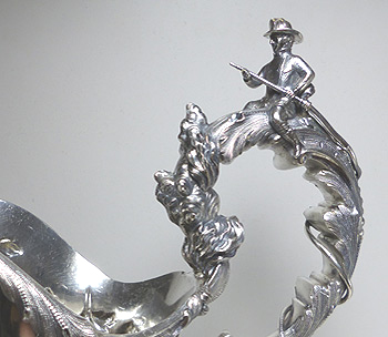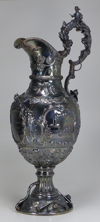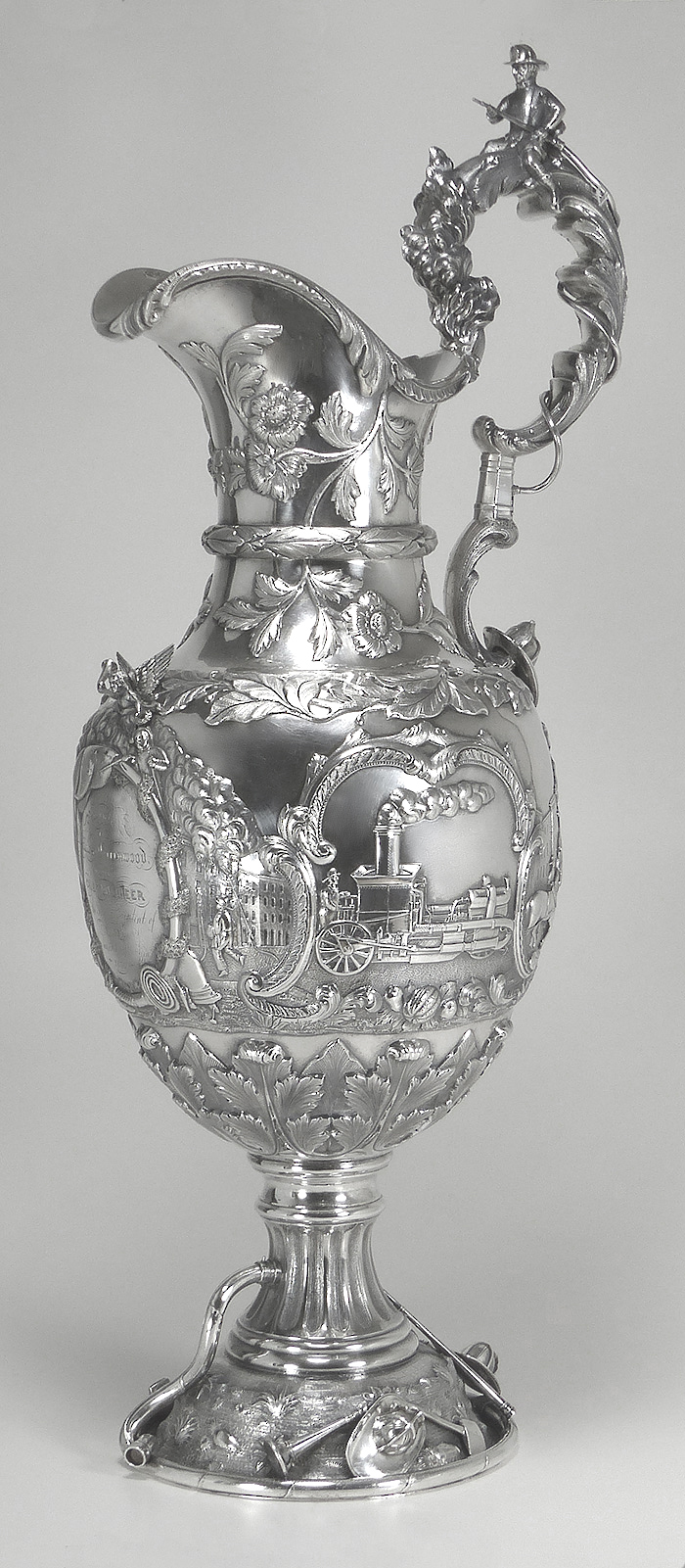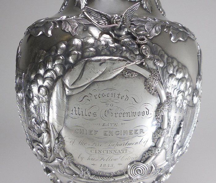 The 21" tall ewer was created in 1855 by Grosjean & Woodward (G&W) of New York, but the commission was most likely taken by Cincinnati retailer Beggs & Smith (1848-1861). The Cincinnati, Ohio, fire department was the first in the nation to pay its firefighters. This ewer was presented to its very first fire chief upon his retirement. The main body and base were both raised from flat discs of silver. The base stem, neck, and spout were seamed and fabricated. The cast elements are the firemen's bugles, helmets, fire axes, and fireman stationed atop the handle. All castings were chased and/or finished prior to assembly. The silversmithing, chasing, and engraving are all beautifully executed. This piece would have been originally patinated, but throughout its life the patina was gradually polished away and encrustation started to form.