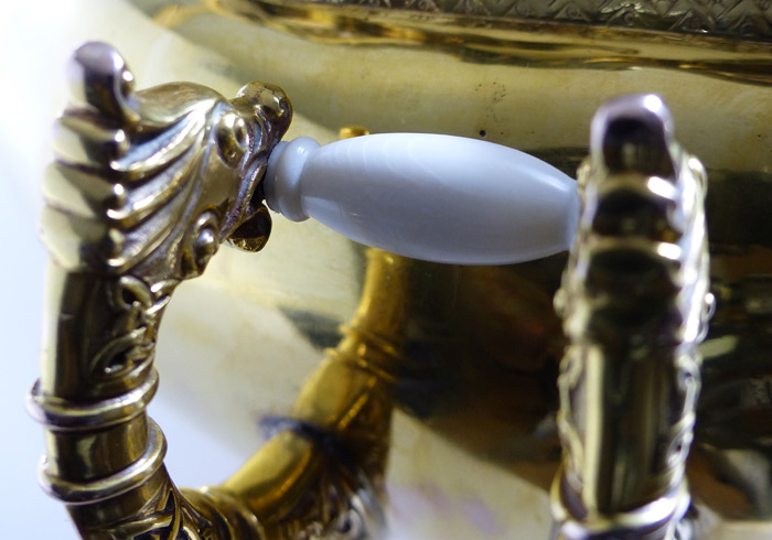 I was asked to turn two new imitation ivory handles for an antique gold bowl. I used Elforyn Super Tusk for the material. These handles are only 1.115" in length, and I knew they were going to be difficult to turn on my 9" lathe. After drilling the holes in the turned-down rods, I used 4-40 threaded rod and secured the blanks with matching nuts. In order to keep the rod from spinning out of control, I drilled a hole in hardwood the same diameter as the rod and mounted it in my tail stock. |