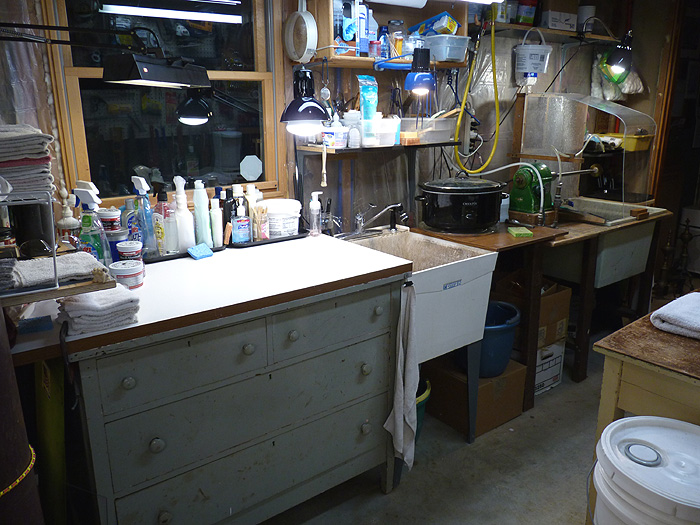The cleaning area. To the right of the image is the motorized scratch brush with Plexiglas shield. The crock pot contains diluted hot 100% plant-based Better Life Dishwashing Liquid that I use for degreasing. The airhose hanging above the crock pot can be seen attached to my compressor.