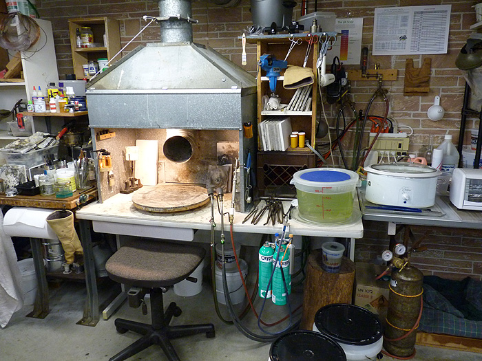 This is my brazing and soldering station. For a close-up of the enclosure interior, go here. I use acetylene and air for one torch and natural gas and compressed air for two others that give me larger, more intense heat. My Miniflam torch hangs to the right of my torch lines – the green canisters). I use this torch for minute brazing and soldering jobs. I use a non-toxic flux (see the air brush with orange liquid inside the enclosure to the left) that is hooked-up to my air compressor. All fumes are pulled back and up through the blower via articulating elbows (out of sight) and this blower. A heat-resistant glove hangs to the left of the bench for emergencies. Miniflam review