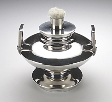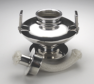 This burner which fits into a water kettle stand had lost its cover. I fabricated a new one with a tapered collar and cotton wick, then patinated it to match the rest of the piece.
