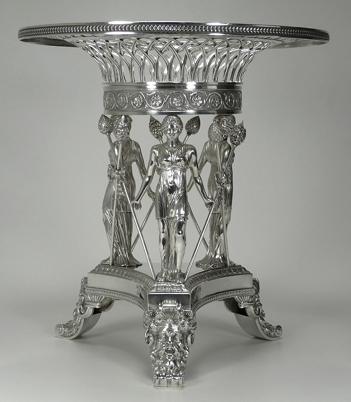This 77 troy-oz. tazza (a shallow cup on a pedestal) came to me with its removeable upper basket tilted and numerous wire elements disconnected. I removed the basket, leveled its rim, and welded the wires back in place. The only finishing required was using a Selvyt cloth sprayed with a small amount of Windex with vinegar to wipe away any fingerprints. With his attention to detail and superb craftsmanship, it's no wonder Storr was considered England's finest silversmith of his day. |