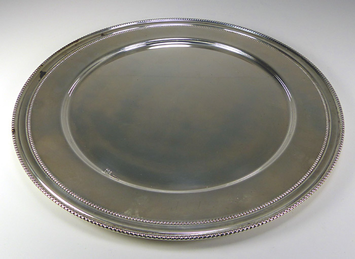 The plate above is covered with rouge-burn, not tarnish. Unlike firestain which is visible over time through aggressive polishing, rouge-burn happens when non-ferrous metal is polished using a polishing machine with a buff traveling at a high rate of speed. If too much pressure is applied to the object, the rouge compound carried in the buff will dig itself into the surface leaving this unattractive orange color. The only way to remove it is by repolishing, as seen below. |