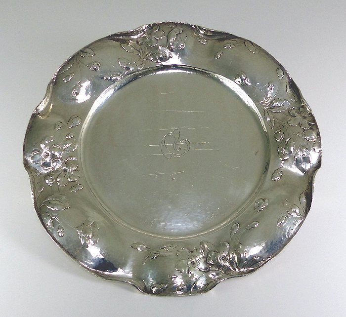 This 10.5" .9584 silver plate came in with major scratches from using it as a carving board. Sacrilege! (ALWAYS cut on a board, not your silver.) I delicately removed the major scratches while retaining the patina (fine age marks) and planished finish. I then cleaned the plate and protected it from tarnishing with MeGuiar's Quik Wax. |