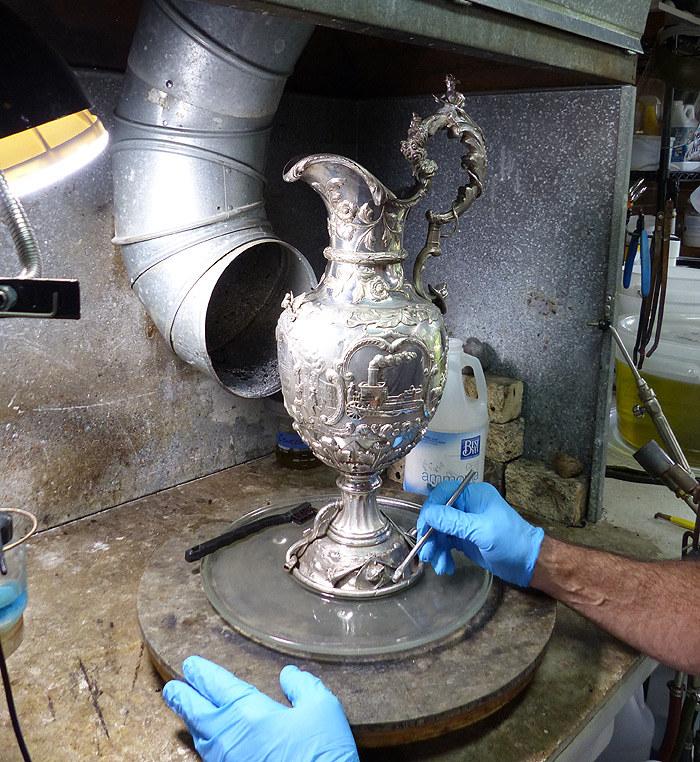 When this important piece of fire department memorabilia arrived, dents had to be removed, extensive encrustation dissolved, and a good overall cleaning performed, including removal of decades-old dried silver polish. The encrustation had etched large areas of the ewer's surface, which was left intact. (The etching could have been burnished smooth, but that wasn't requested by the collector.) Above: Removing encrustation after the dents were removed. |