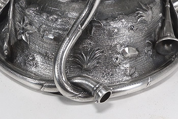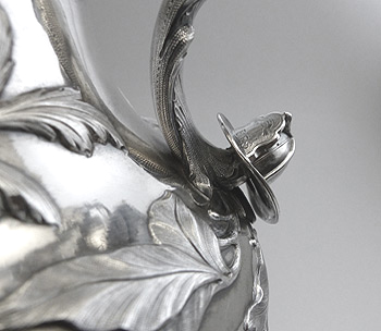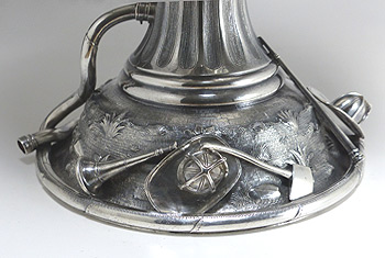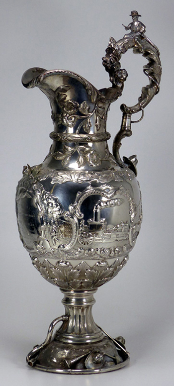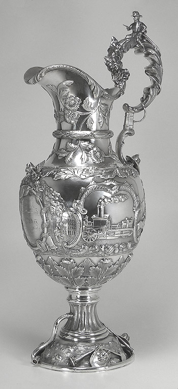 The 21" tall ewer was created in 1855 by Grosjean & Woodward (G&W) of New York, but the commission was most likely taken by Cincinnati retailer Beggs & Smith (1848-1861). The Cincinnati, Ohio, fire department was the first in the nation to pay its firefighters. This ewer was presented to its very first fire chief upon his retirement. The main body and base were both raised from flat discs of silver. The base stem, neck, and spout were seamed and fabricated. The cast elements are the firemen's bugles, helmets, fire axes, and fireman stationed atop the handle. All castings were chased and/or finished prior to assembly. The silversmithing, chasing, and engraving are all beautifully executed. This piece would have been originally patinated, but throughout its life the patina was gradually polished away and encrustation started to form.