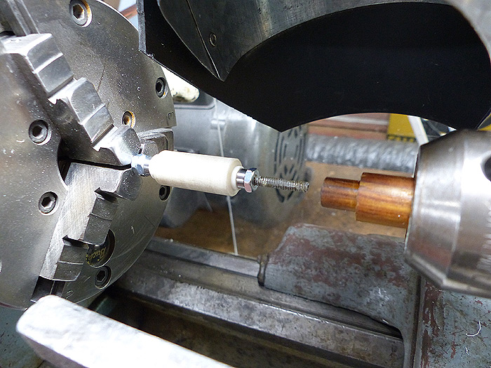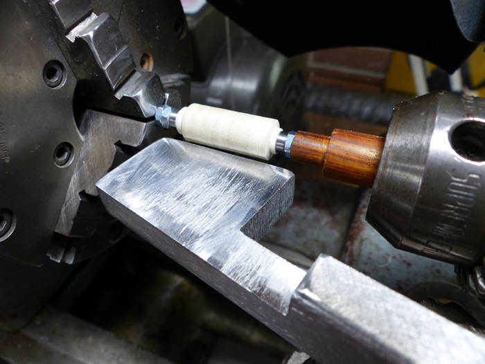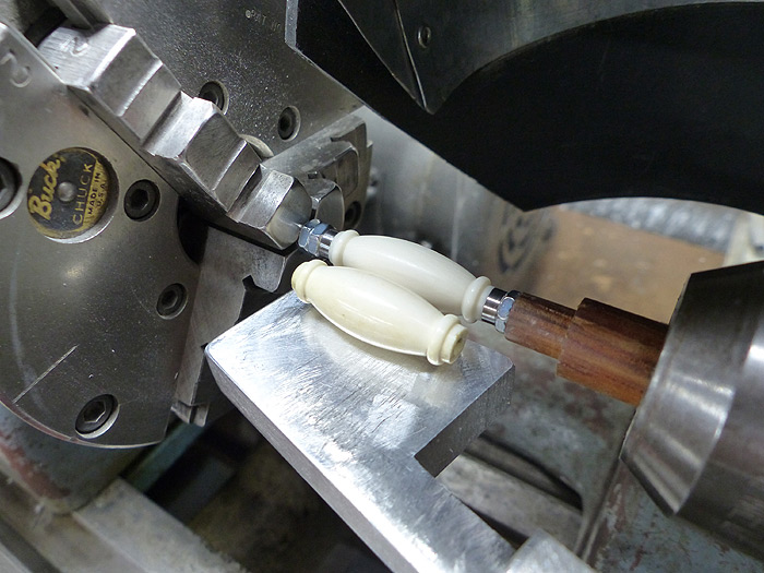 I was asked to turn two new imitation ivory handles for an antique gold bowl. I used Elforyn Super Tusk for the material. These handles are only 1.115" in length, and I knew they were going to be difficult to turn on my 9" lathe. After drilling the holes in the turned-down rods, I used 4-40 threaded rod and secured the blanks with matching nuts. In order to keep the rod from spinning out of control, I drilled a hole in hardwood the same diameter as the rod and mounted it in my tail stock. |