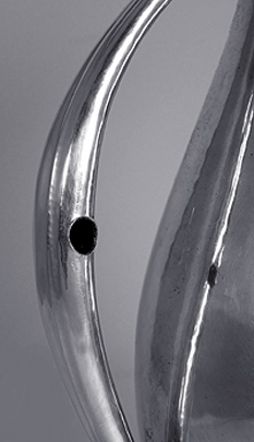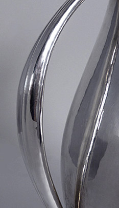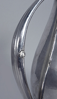 Removing handle dents can be challenging. Sometimes the material can be too heavy to solder a wire to the center of the dent and pull it out. This was the case with this water pitcher handle. I had to drill a 1/4" hole into the side of the handle and insert a tool to push the dent out. I then plugged the hole with a tapered sterling rod and pulse arc welded it in place with sterling wire, resulting in an invisible repair. |