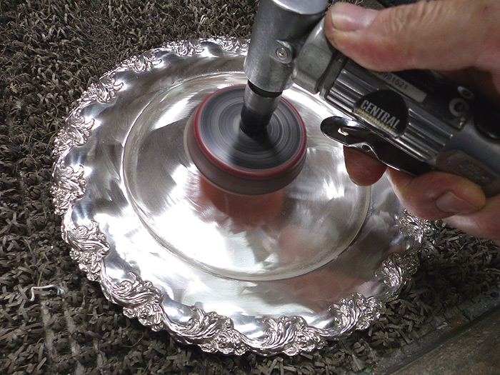 This 10" plate (one of six in the set) was terribly scratched due to overzealous cutters of food. I used a right-angle grinder with abrasives up to 2000-grit then machine-polished them. They were then hand-rubbed for the final soft, antique finish. |
