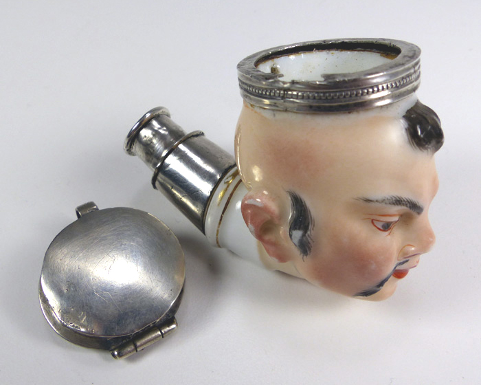 This hand painted silver and porcelain pipe was sent to me because of a poor repair. The hinged cover and lower band were both mounted to the side as opposed to the back of the head. I removed the band, removed the major dents around the crushed gallery decoration, then welded the cover's hinge assembly back. The top was then remounted so the hinge was in the rear. Sterling was added to the front of the band so the reformed thumbpiece would click shut when the cover is closed. I maintained the original finish and only cleaned the pipe. Historical background for the porcelain pipe from the owner... "According to an entry in the Vielsdorf registry, October 1772 we found the design descriptions for this pipe. We can conclusively state where and when it was made. It is the only survivor, and an extreme rarity. It came to me from the Musee de la Pipe in Lausanne, Switzerland after the Museum closed down. These 18th century porcelain pipes are few and far between, very rare, and seldom seen outside Museum venues. They can he found scattered around the world in the collections of the V&A, Smithsonian, Museum De Grasse library Baroness Alice de Rothschild, and the Amsterdam Pipe Museum. I currently have the most pipes in private hands." |