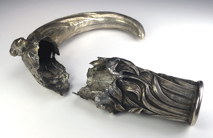 The results from the reconstructive surgery! A steel reinforcing rod and urethane were inserted prior to reattaching the head to the shaft with epoxy. The cane is now ready for the full weight of the user to be applied. |