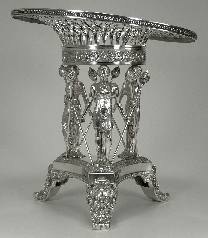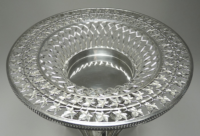 This 77 troy-oz. tazza (a shallow cup on a pedestal) came to me with its removeable upper basket tilted and numerous wire elements disconnected. I removed the basket, leveled its rim, and welded the wires back in place. The only finishing required was using a Selvyt cloth sprayed with a small amount of Windex with vinegar to wipe away any fingerprints. With his attention to detail and superb craftsmanship, it's no wonder Storr was considered England's finest silversmith of his day. |